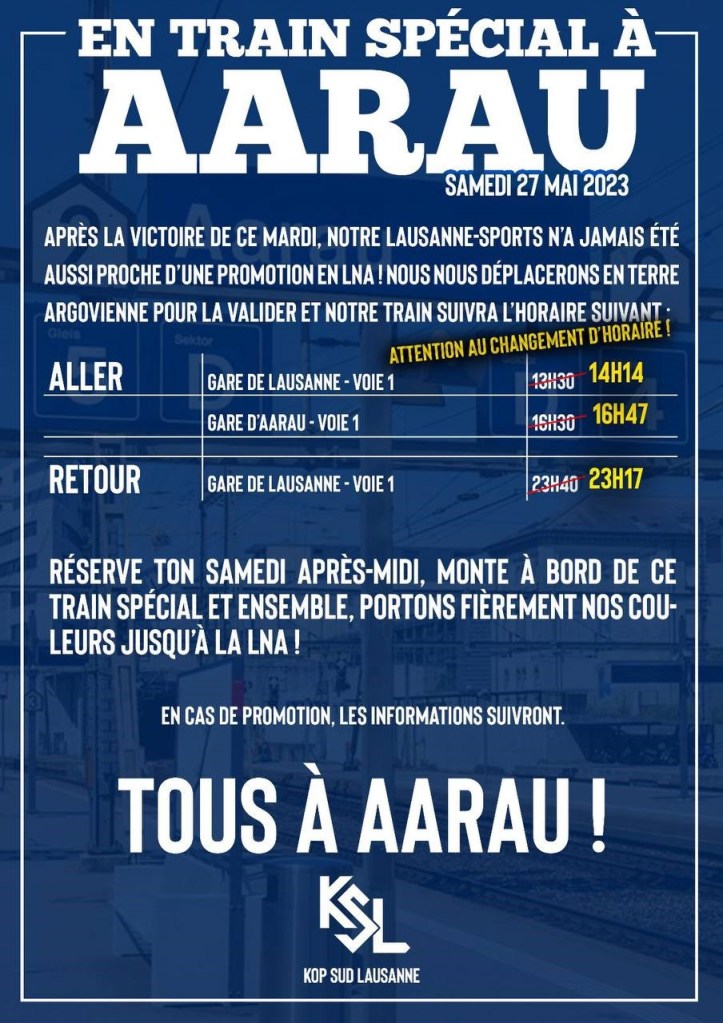 Le FC Lausanne-Sport se déplace ce samedi à Aarau pour, on l’espère, fêter une promotion tant attendue. Le Kop Sud Lausanne organise un train spécial (voir affiche ci-dessous) et les billet du match (secteur visiteurs) seront en vente dans le train. Les billets de train (aller-retour) sont au prix de CHF 29.- avec le demi-tarif /moins de 16 ans ou CHF 58.- plein tarif par tête de pipe. Pour les réservations et plus d’informations, le Kop Sud est à votre disposition via Instagram (ls_kop_sud) ou Facebook (Loz Boys). Si c’est votre premier déplacement en train spécial, les CFF vous communiquent ce qu’il faut savoir ici.